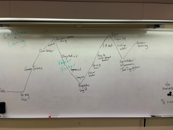 Sen så exemplifierade jag med en tidslinje över mitt förhållande till läsning. Detta gjorde jag på tavlan och visade på hur man kunde jobba med vändningar och kurvor i sitt berättande.