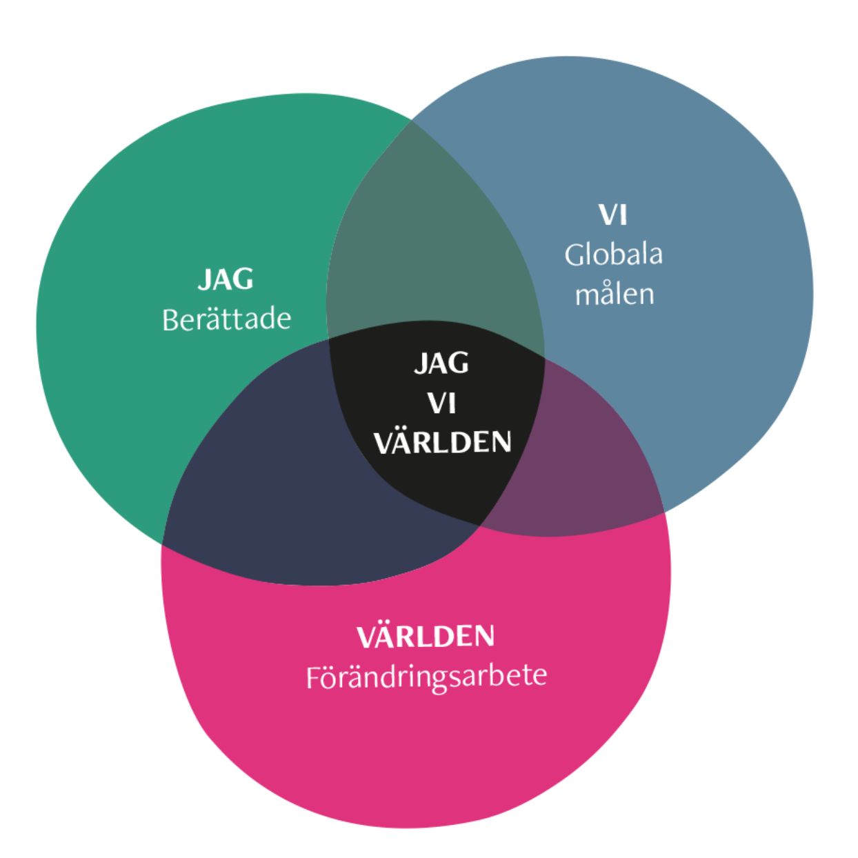 Jag-vi-världen är en engagemangsresa som är uppdelad i tre delar. Den tar avstamp i den egna berättelsen, tar sig via de globala målen, för att landa i ett eget förändringsarbete. Varje del är fylld med olika övningar och metoder. Använd övningarna som en helhet eller plocka de delar som passar bäst för just din undervisning. Det går bra att arbeta med metoden under ett helt läsår eller bara under en dag.