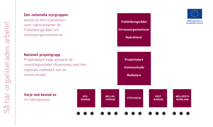 ESF-projektet VÄGEN omfattade 15 skolor i hela landet. För att lyckas med bottom up och lärloopar i ett så stort projekt organiserades arbetet på flera olika nivåer. Genom återkommande och systematisk återkoppling kunde insikter från folkhögskolorna omsättas i beslut och justeringar på regional och nationell nivå.